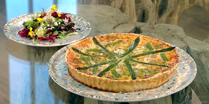 Asparagus and crab tart with a thyme and garlic dressed salad