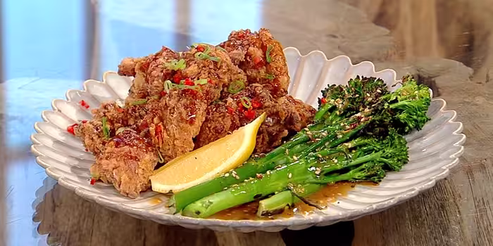 Japanese-style fried chicken with broccoli and toasted sesame sauce