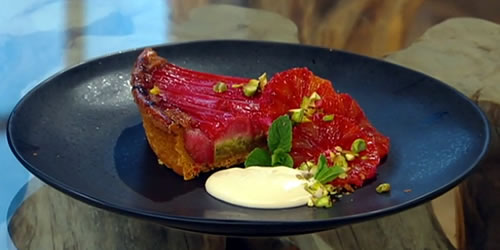 Reduce the oven temperature to 180C/160C Fan/Gas 4. Place the pastry case on a baking tray and fill with the frangipane mixture. Decorate with the cooked rhubarb, sprinkle with some caster sugar and bake for 45 minutes. Remove from the oven and cool.