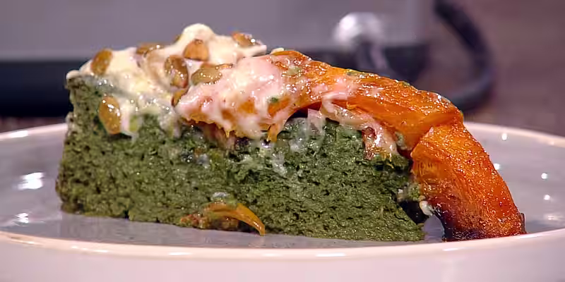Slice the spinach and ricotta cake while it’s still warm. The creamy centre, earthy mushrooms, sweet squash and tangy gorgonzola cream make each slice feel like a proper celebration dish.