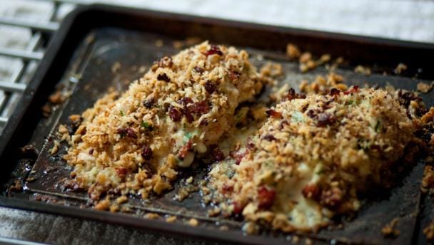 Scatter the breadcrumb mix over the chicken breasts, patting them down lightly.