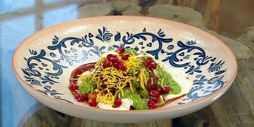 • Sprinkle with chickpea sev, pomegranate seeds, and chaat masala.