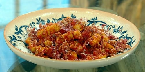 Spoon the gnocchi and sauce on to the plate and sprinkle over the crispy salami, finish with grated Parmesan cheese.