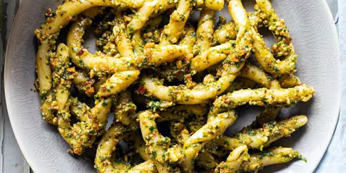 - Combine. Reserve a tablespoon of pasta water, drain busiate, and mix directly with the pesto until glossy and well-coated.