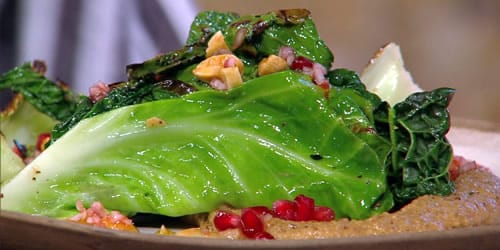 An elegant vegetarian dish of rich, velvety texture caramelised cauliflower purée with vibrant, slightly charred greens and a zesty almond dressing. Created by chef Matt Tebbutt, it offers a restaurant-quality experience that can be prepared in under 30 minutes.