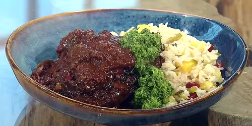 - To serve: Divide beef cheek, spoon sauce and green seasoning over the top, serve pineapple rice alongside.