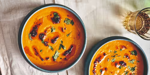 Vibrant carrot and orange soup a delightful blend of flavours, combining earthy spices with the sweetness of carrots and citrus.