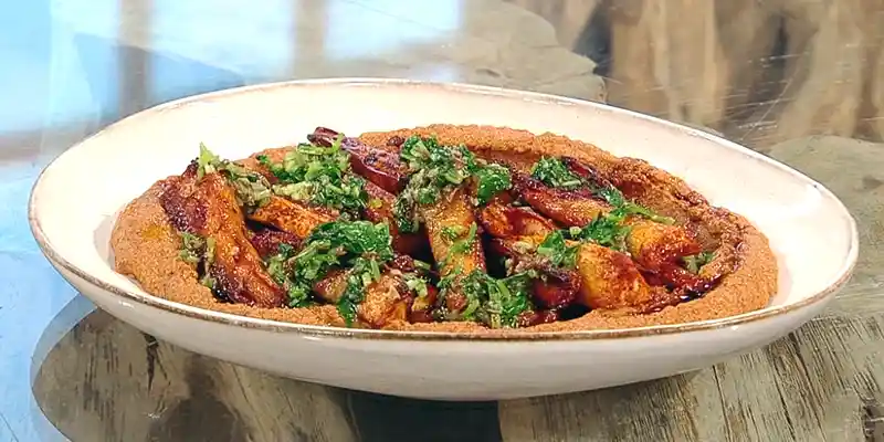 Dhahabiya combines tender, caramelised spiced roast parsnips with a vibrant, smoky muhammara dip, creating a dish rich in Middle Eastern flavours. Muhammara is a Middle Eastern dip made from roasted red peppers and walnuts, known for its complex flavor profile that is smoky, sweet, savory, and slightly spicy.