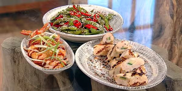 Three Japanese-inspired small plates perfect for relaxed sharing: stir-fried edamame beans with sesame and oyster sauce, delicate chikuwa fish cakes seasoned with shichimi togarashi, and crispy panko-coated ebi prawns served with zig-zag mayo and okonomiyaki sauces. Quick to prepare, impressive presentation, nut-free throughout.