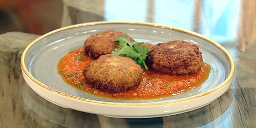 Apply a little oil to your palms, take a spoonful of the mixture and form it into a ball. Repeat with the rest of the mixture, then flatten each ball slightly to make a small patty. (If preferred you can leave them round – the shape is for you to decide.)