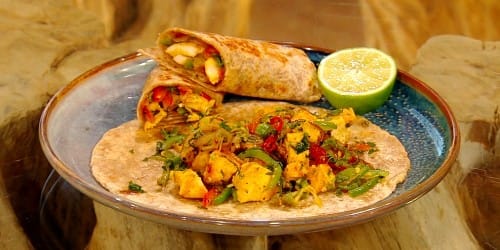 To serve, partly cool the chicken tikka, then slice into strips. Put the tikka in a tortilla or a chapatti, place some salad alongside, then roll the tortilla or the chapati tightly so that the roll is nice and tight.