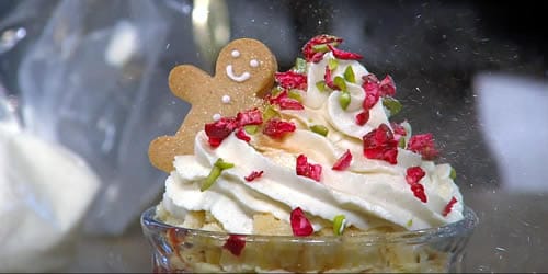 - Top with gingerbread cream, pistachios, cranberries, and mini gingerbread men.