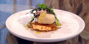 Potato rosti with fried pollock, chicken skin mayo and mustard leaf salad