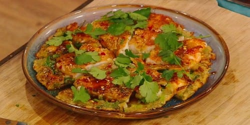 When you are ready to cook the prawn fritters, remove the batter from the fridge and add the coriander, garlic, ginger, chilli paste, spring onions and fish sauce. Heat a frying pan and add the oil. Once hot, ladle the batter into the pan and quickly sprinkle with the chopped prawns. Fry one side for a few minutes, then flip over using a spatula. Continue cooking for another few minutes.