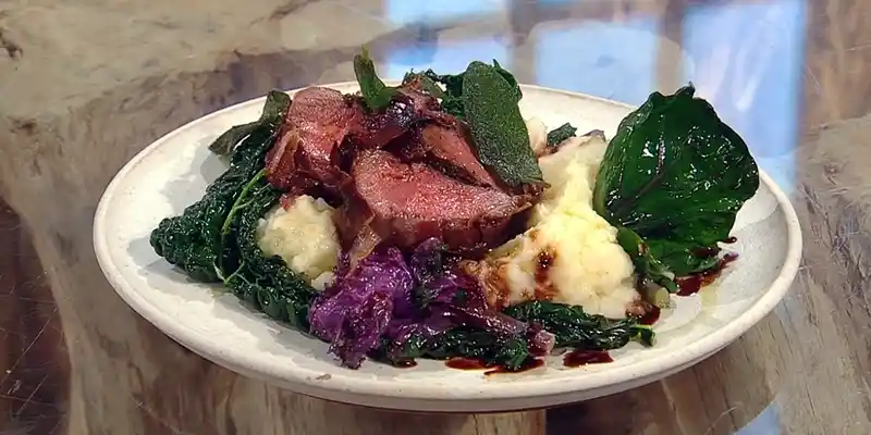 - Serve family style. Remove the string from the rested venison and carve into thick slices. Spoon the hot barolo chocolate sauce over the top. Serve with potato celeriac mash and braised winter greens. Pass extra sauce around the table.
