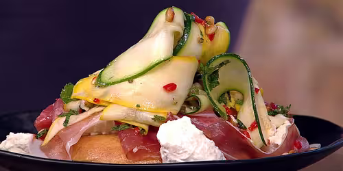 - Bring it all together: Arrange the Parma ham over the baked brioche, pile on the courgette salad, crumble over the ricotta (or feta), and finish with toasted pine nuts. Serve warm for best flavour and texture.