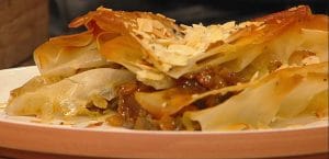 Oil a round ovenproof frying pan or pie dish and line the base with layers of filo, ensuring a few centimetres of overhang. Brush the filo pastry sheets with the vegetable oil between each layer for extra crispiness. Put the cooled filling in the centre and wrap the edges up and over creating a rough parcel. Brush with more vegetable oil. Sprinkle with the almonds and bake for 25 minutes, or until golden-brown. Serve in slices.