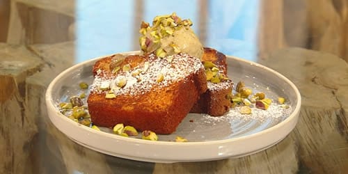 Prepare yourself for a delightful treat with this marzipan cake. Cooked to perfection, it’s sliced into delectable portions and then toasted to add a hint of warmth and crunch. The slices are served alongside a generous scoop of creamy pistachio ice cream, creating a harmonious combination that will surely satisfy your taste buds.