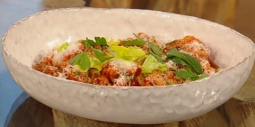 Add the tomato puree and cook for a further 2 minutes. Deglaze the pan with the white wine and then add the tomatoes and chicken stock and cook for a further 5 minutes. Then add the tripe into the pan and simmer for a further 2 hours.