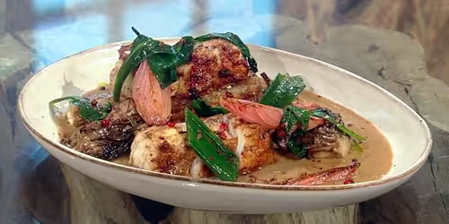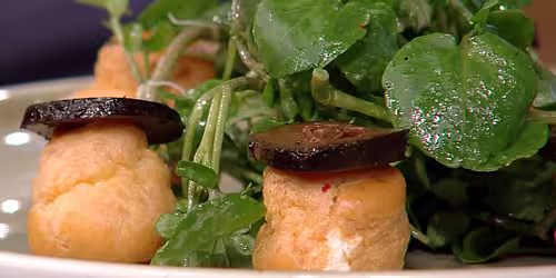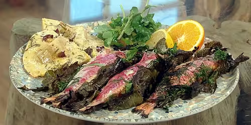 Red mullet wrapped in vine leaves with artichoke and black olive socca bread