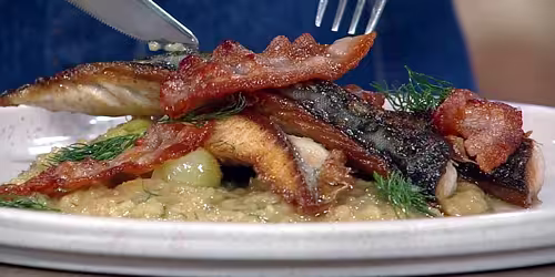 Butterflied sea bass with shoestring fries and salad