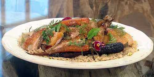 Roast guinea fowl with pistachio pilaf rice and lobster bisque