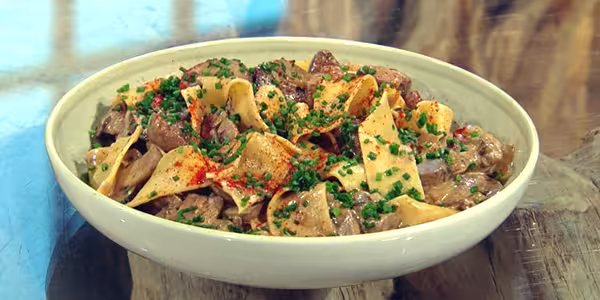 - Cook the pappardelle. Boil in well-salted water until just tender. Drain and serve straight away with the stroganoff.